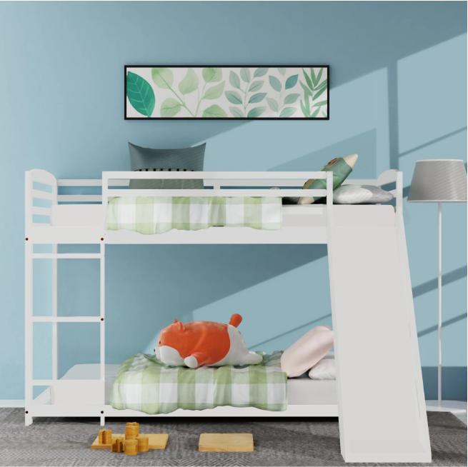 This twin over twin bunk bed with slide is perfect for your home If you need extra sleeping space or you love sleepovers. The built-in ladder provides easy access to the top bed. For added extra fun, the smooth slide is included and can be put either left or right. High-quality, solid pine legs and a strong, durable frame ensure stability and durability for long-term use. This low bunk bed for kids is designed with a clean silhouette and a hue of elegance. It suits all styles of home decoration and completes the look of any bedroom.